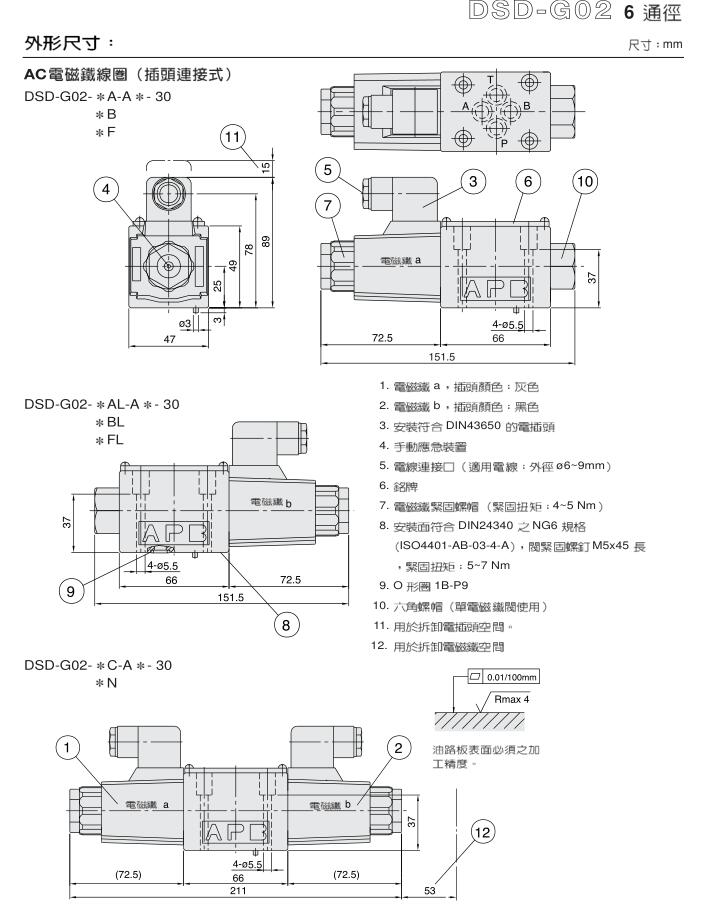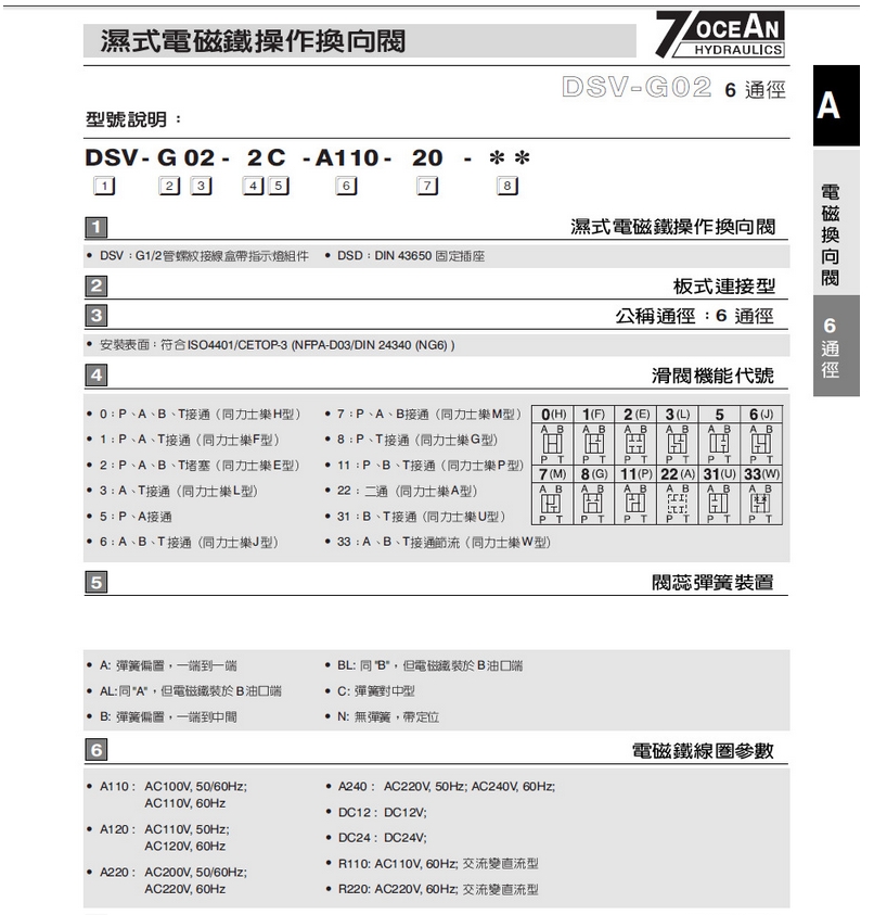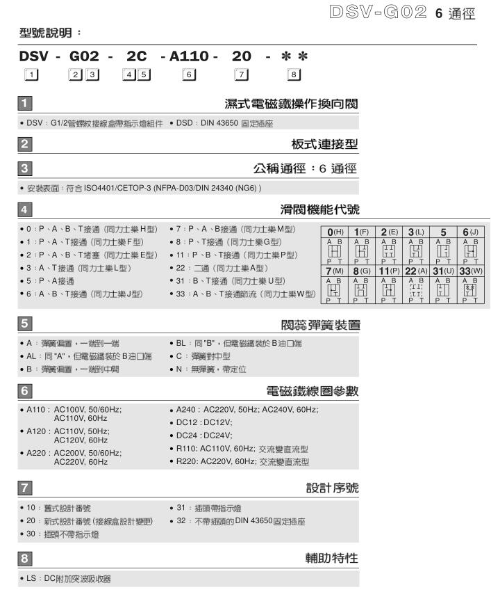 6通經(jīng)單頭電磁閥DSV-G02-2A-DC24-82 臺(tái)灣七洋液壓供應(yīng)臺(tái)灣電磁閥件系列特性: o 先導(dǎo)型壓力調(diào)節(jié)設(shè)計(jì)。 o 不須管道連接,減少漏油機(jī)會(huì)及配管成本。 o 泄漏小,低震動(dòng),低噪音,易保養(yǎng)。 o 閥體緊湊結(jié)合,減少系統(tǒng)要求空間。 o 具有四種結(jié)構(gòu)設(shè)計(jì)及四種壓力調(diào)整范圍。 o 適用于ISO,CETOP,NFPA和DIN國(guó)際標(biāo)準(zhǔn)之安裝面。